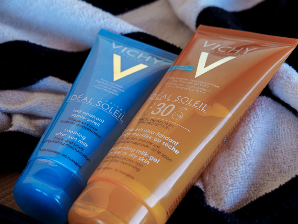 J’utilise la crème « Ideal » de Vichy que j’aime beaucoup pour sa légèreté. Et la crème après soleil de la même gamme pour apaiser ma peau quand elle rougie un peu. C’est frais et doux sur la peau : j’adore !